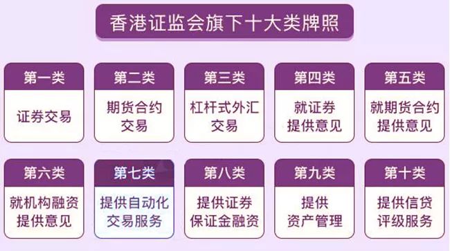 中國(guó)香港市場(chǎng)執(zhí)行的是金融牌照管理制度,金融機(jī)構(gòu)可以同時(shí)申請(qǐng)多類牌照,為境內(nèi)外各類機(jī)構(gòu)與個(gè)人投資者提供特定領(lǐng)域的金融服務(wù)。在資管領(lǐng)域,根據(jù)中國(guó)香港《證券及期貨條例》,目前共有10類受規(guī)管活動(dòng)需要向中國(guó)香港證券及期貨事務(wù)監(jiān)察委員會(huì)(SFC,簡(jiǎn)稱"中國(guó)香港證監(jiān)會(huì)")申請(qǐng)牌照,具體如下: