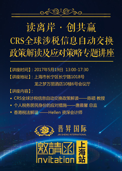 但正確應(yīng)對(duì)CRS的前提是,你必須對(duì)CRS有全面、深入的了解。鑒于CRS與我司客戶的利益息息相關(guān),為了讓廣大客戶更深刻地了解CRS,更好地應(yīng)對(duì)CRS可能帶給大家的影響,我司特別安排了一系列CRS專題講座。5月19日,我司將舉辦第五場(chǎng)(上海站)CRS講座,并邀請(qǐng)了多位老師為大家全方位解讀CRS,詳細(xì)對(duì)CRS的熱點(diǎn)政策、實(shí)施步驟及各類風(fēng)險(xiǎn)作深度的剖析解讀,并提出合理的解決方案,以幫助大家更好地應(yīng)對(duì)CRS。有興趣的朋友趕緊報(bào)名參加我們的講座,現(xiàn)場(chǎng)名額有限,先到先得哦~