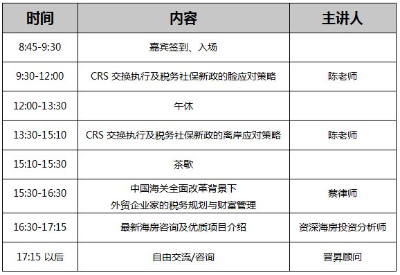 “CRS交換執(zhí)行及稅務(wù)社保新政的離岸應(yīng)對策略”、“中國海關(guān)全面改革背景下,外貿(mào)企業(yè)家的稅務(wù)規(guī)劃與財富管理”、以及備受關(guān)注的海外房產(chǎn)的評估選擇三大熱點話題,抽絲剝繭解析國內(nèi)外環(huán)境與新政,助力廣大高凈值及企業(yè)家的財富管理與企業(yè)發(fā)展之路撥云見日,穩(wěn)健前行!