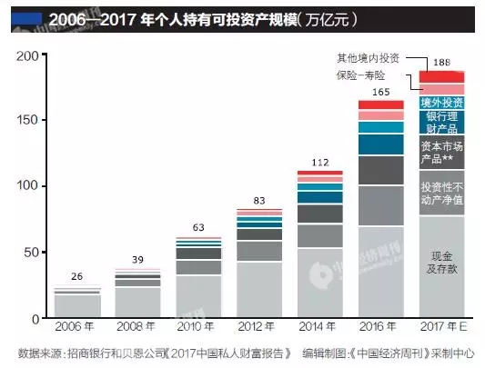 招行和貝恩的報告預(yù)計,2017年高凈值人群持有財富總量將達58萬億元,同比增長19%,人均擁有3670萬元可投資資產(chǎn)。中國私人財富市場總體處于快速增長階段,具有巨大增長潛力和空間。