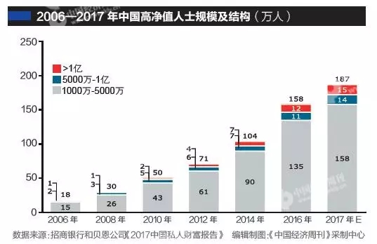 根據(jù)招行和貝恩的報告,高凈值人士的數(shù)量從2006年的18萬人增長到2016年的158萬人,相當(dāng)于過去11年間,每天有接近400張“新面孔”躋身高凈值人士行列。