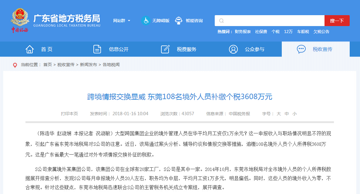 1月16日,廣東省地稅局刊登了一則題為《跨境情報(bào)交換顯威東莞108名境外人員補(bǔ)繳個(gè)稅3608萬元》的新聞,新聞中指出,東莞市地稅局近日追繳108名境外人員個(gè)人所得稅3608萬元。這是廣東省大一筆通過對(duì)外專項(xiàng)情報(bào)交換補(bǔ)征的稅款。