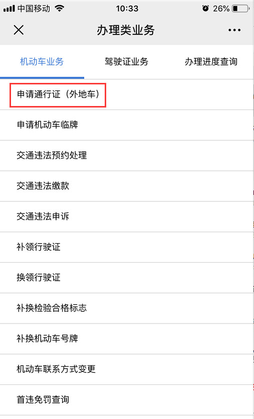 關(guān)注公眾號【深圳交警】點擊【星級用戶】進(jìn)入頁面,然后點擊【辦理類業(yè)務(wù)】,進(jìn)入后點擊【申請通行證(外地車)】即可申請。