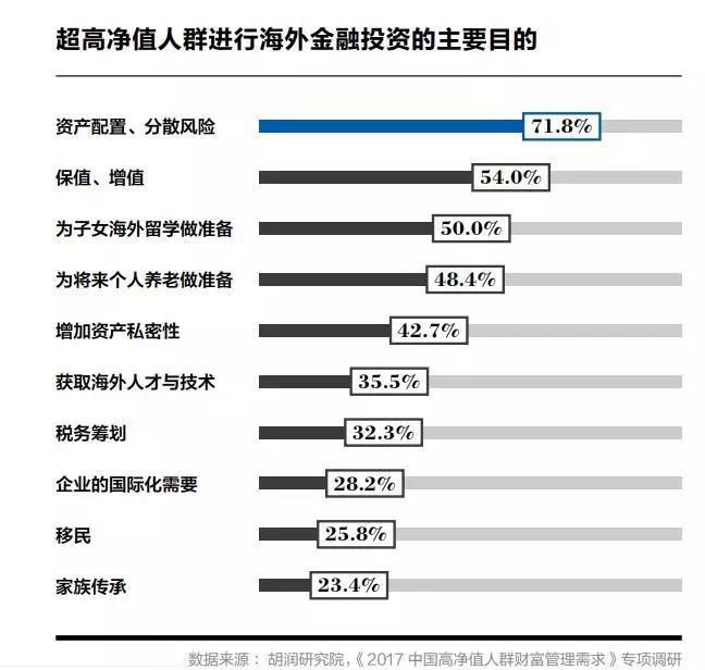 “資產(chǎn)配置、分散風(fēng)險(xiǎn)”是超高凈值人群進(jìn)行海外金融投資的最主要目的,占比高達(dá)71.8%;其次是財(cái)富的“保值、增值”、“為子女境外留學(xué)做準(zhǔn)備”和“為將來(lái)個(gè)人養(yǎng)老做準(zhǔn)備”。