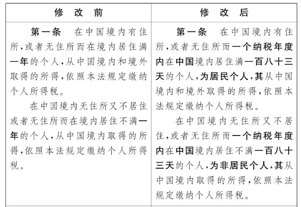 依據(jù)財(cái)政部部長(zhǎng)劉昆關(guān)于《中華人民共和國(guó)個(gè)人所得稅法修正案(草案)》的說(shuō)明,個(gè)稅法對(duì)財(cái)政居民的規(guī)則已做更改:將“在我國(guó)境內(nèi)居住的時(shí)間”作為斷定居民個(gè)人和非居民個(gè)人的依據(jù),由“是否居住滿(mǎn)1年”調(diào)整為“是否居住滿(mǎn)183天”。詳細(xì)條文更改請(qǐng)見(jiàn)下圖: