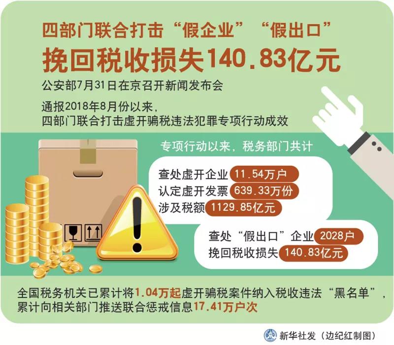 7月31日,公安部在京召開新聞發(fā)布會,通報2018年8月份以來,四部門聯(lián)合打擊虛開騙稅違法犯罪專項行動成效。專項行動以來,稅務(wù)部門共計查處虛開企業(yè)11.54萬戶,認(rèn)定虛開發(fā)票639.33萬份,涉及稅額1129.85億元;查處“假出口”企業(yè)2028戶,挽回稅收損失140.83億元。