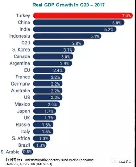 2003年-2017年,土耳其經(jīng)濟經(jīng)歷了15年的高速發(fā)展。在2017年OECD對G20成員國GDP實際增速的統(tǒng)計中,土耳其以7.4%的增速位列之首。2018年GDP排名18,超過瑞士(20)和中國香港(35)