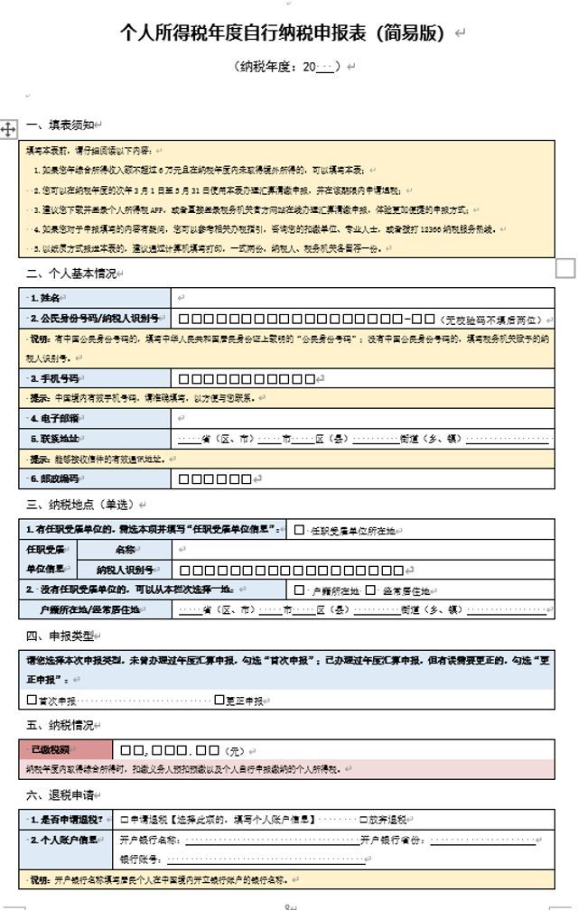 其中,A表還包含簡易版,此表格不需要填列扣除項(xiàng)目,僅就個(gè)人基本情況、申報(bào)類型、納稅地點(diǎn)、已繳稅額等情況作出說明即可。